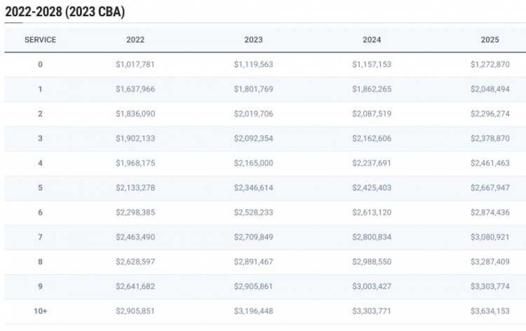 NBA里有底薪这个概念,这是正式合同球员的最低工资,不过NBA里的底薪较为复杂,不仅每个赛季的数字会变化,而且同一个赛季里也分为11档,对应刚进入NBA的球员到在NBA打过至少10年的球员,如下图: