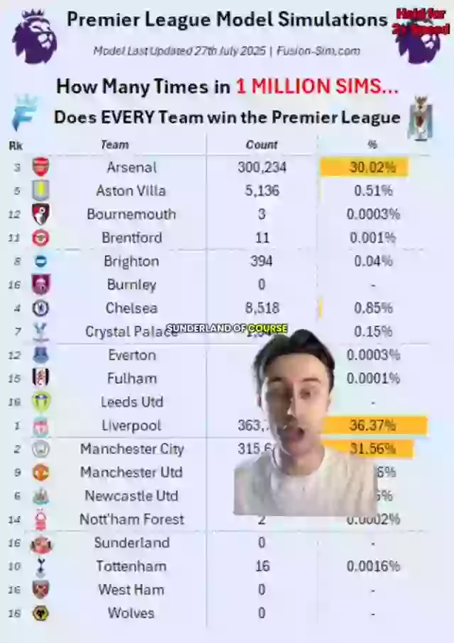 此外,伯恩利、利兹联、桑德兰、西汉姆联和狼队在一百万次模拟中未能有一次获得英超冠军。